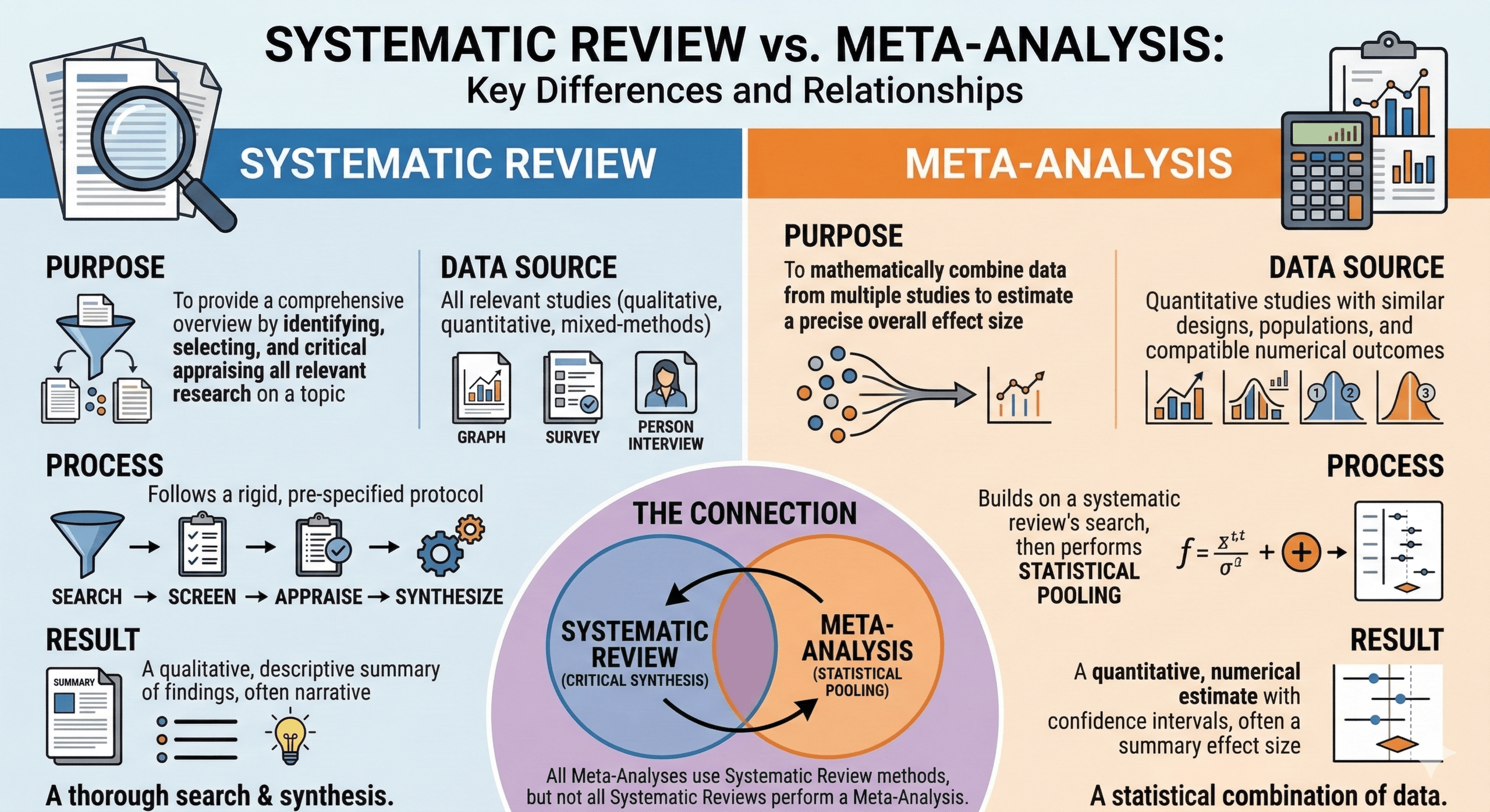 | Definition | A structured method to identify, evaluate, and summaries all relevant studies | A statistical technique that combines results from multiple studies |